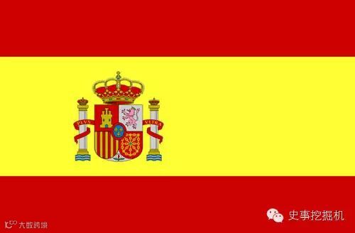 西班牙国旗:红、黄两色象征着人民对祖国的一片赤胆忠心。国徽中心的盾徽画着代表组成西班牙的五个国家的图案:红底金色城堡与白地紫狮分别代表卡斯提尔(Castille)和雷恩(Leon)王国,垂直的红、黄条纹是亚拉冈(Aragon)王国的代表色,红地上的金色链网纵横相交的十字代表纳瓦尔(Navarre)王国,最下方的石榴花代表格兰那达(Granada)王国。两根赫拉克勒斯神柱威然屹立在盾徽两边,一条红色饰带绕过银柱,上面写着“航向世界更远的地方”;但在发现美洲之前,饰带上写着“这里是世界的边缘”。