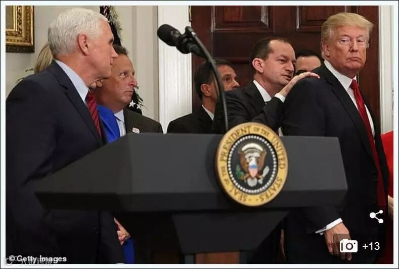 然后是去年10月12日在白宫发生的事,当时特朗普召集多名政府官员准备签署一项行政命令。在发表完讲话并与到场嘉宾握手后,特朗普又打算直接走人了。副总统彭斯于是站出来提醒他,字还没签呢。