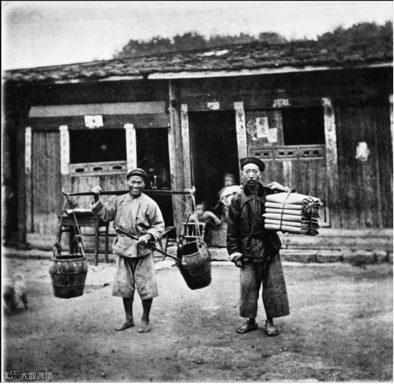 这是两名挑着担子的中国苦力,物品挂在竹扁担的两端,重量都压在挑担子的人的肩上。苦力是一群很不起眼的小人物。他很穷,但是乐观又知足,吃苦耐劳,生活上也不挑剔。
