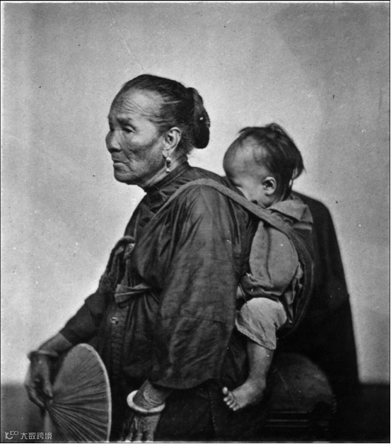 照片上的老妇人跟儿子一家一起生活在船上,她仍然高高兴兴地摇橹撑船,帮助补贴家用,一边也帮着照看孙子。她背上的孩子也许是长孙,那是一家人的骄傲,也是她晚年生活的希望。孩子被装在布兜里背在肩上,这是汉族人携带婴儿的方式,当他睡着的时候他把脸埋在背负者的背上。这种方式十分普遍,一定程度上解释了为什么中国的船民和劳动阶层都长着扁平的脸和宽宽的鼻子。