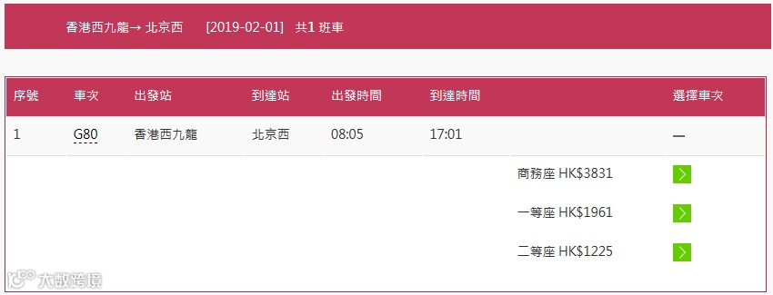 我们可以看到,这一班前往北京的列车,在内地的票已经全部售罄了。如果通过香港渠道买的话,3种车厢都还有票~