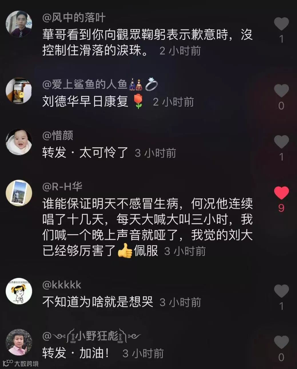 有粉丝评论称:“连续13天的劳累,偶像实在是太拼了,身体吃不消,唱不到3首歌就声音沙哑了。”也有歌迷在社交平台发照片表示,57岁的刘德华积劳成疾,嗓子突然失声,他现场的表情很痛苦,让人心疼。有现场网友表示:“刘德华无法坚持演唱后一直在哭,不停地向观众鞠躬致歉,很多歌迷也跟着哭了!”