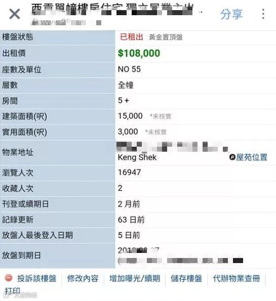 “币少爷”豪宅被发现挂在中介网站上出租 图片来自香港网络