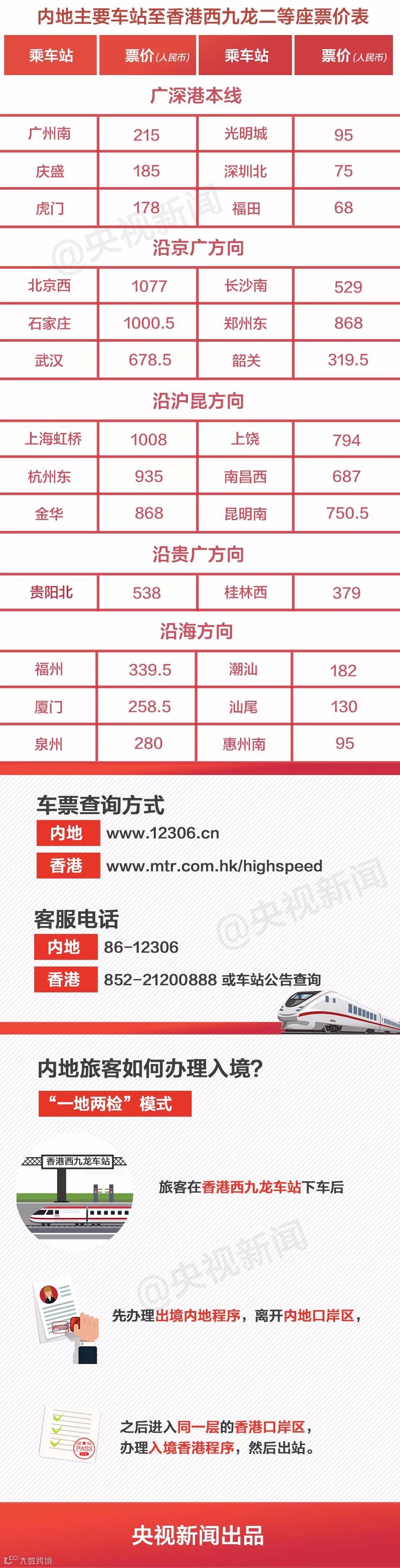 注:香港至内地城市高铁票价,按双方运营企业分段计费、各自定价、加总核收的方式确定,以人民币定价,并根据市场实际情况在公布票价范围内进行浮动,在香港以港币标价,在内地以人民币标价。