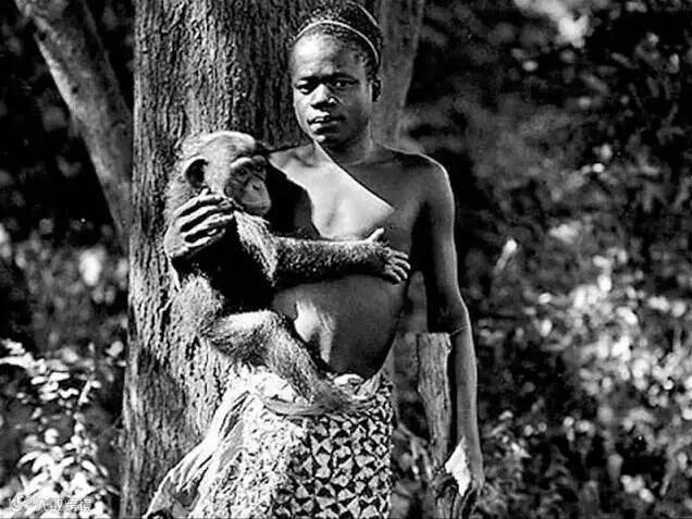 3、一名刚果男人,于1906年在纽约市的布朗克斯动物园展出,并被迫随身携带猩猩和其他类人猿。
