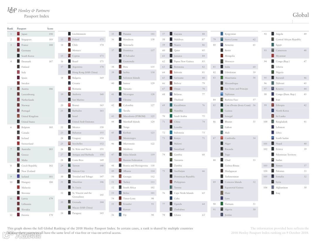亨利护照指数是世界上所有护照的排名,根据其持有者免签证旅行的国家数量。 该排名基于国际航空运输协会(IATA)的独家数据,该协会拥有世界上最大,最全面的旅游信息数据库,并通过广泛的内部研究得到加强。