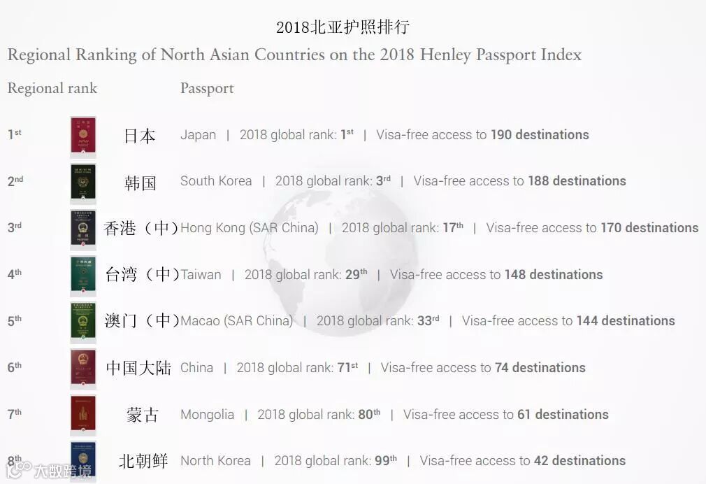 直接贴上两个排名,一个是全球排名,另一个是北亚排名。这个名次是按免签国家(确切地说应该叫旅行目的地)数量排的,注意,需要政府批准的电子签不算免签国哦,正儿八经的拿着护照就能通关的才算哦。分数计算是这样的,免签一个国家就得一分,最后算总分。(具体的计算方法也贴出来了呢,在最后)