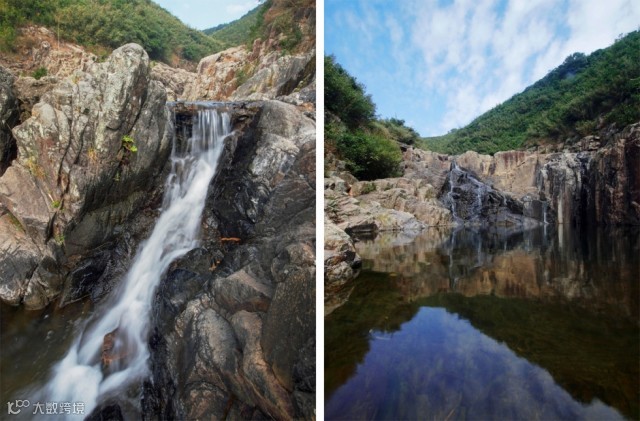 从海滩往北走就能看到流经这里的双鹿石涧,再沿着溪涧南岸继续前行,不一会就能发现一片层层叠叠的小瀑布。如果想看更长更高的瀑布,就需要顺着光秃秃的岩石向上攀爬了,只要到达高处的冲击潭,眼前的景致就绝不会让你后悔。