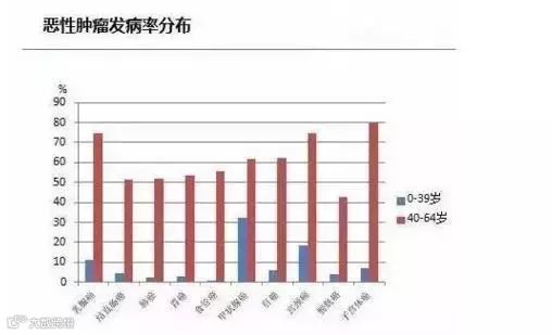 蓝色条状是0-39岁的恶性肿瘤发病率,红色代表40-64岁的恶性肿瘤发病率。
