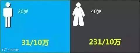 根据《肿瘤登记年报》,恶性肿瘤的发病率在0到39岁组处于较低水平,40岁以后开始快速升高。上图为广州癌症发病率数据,40岁是20岁的7.45倍。