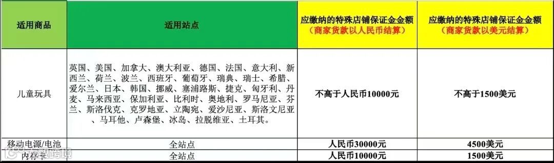 儿童玩具类目在美、英、德、法等39个国家和地区的保证金统一上调至1万元人民币; -