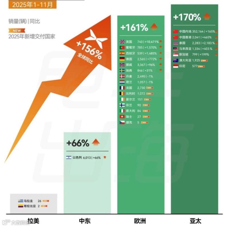 和国内知名度、销量都较为领先的比亚迪相比,今年来自广州的小鹏汽车表现格外亮眼。据行业调研机构电车出海的报告,今年前11月,小鹏汽车在欧洲迎来全面爆发,销量同比增长161%,与大本营亚太市场增幅差距仅有9%。