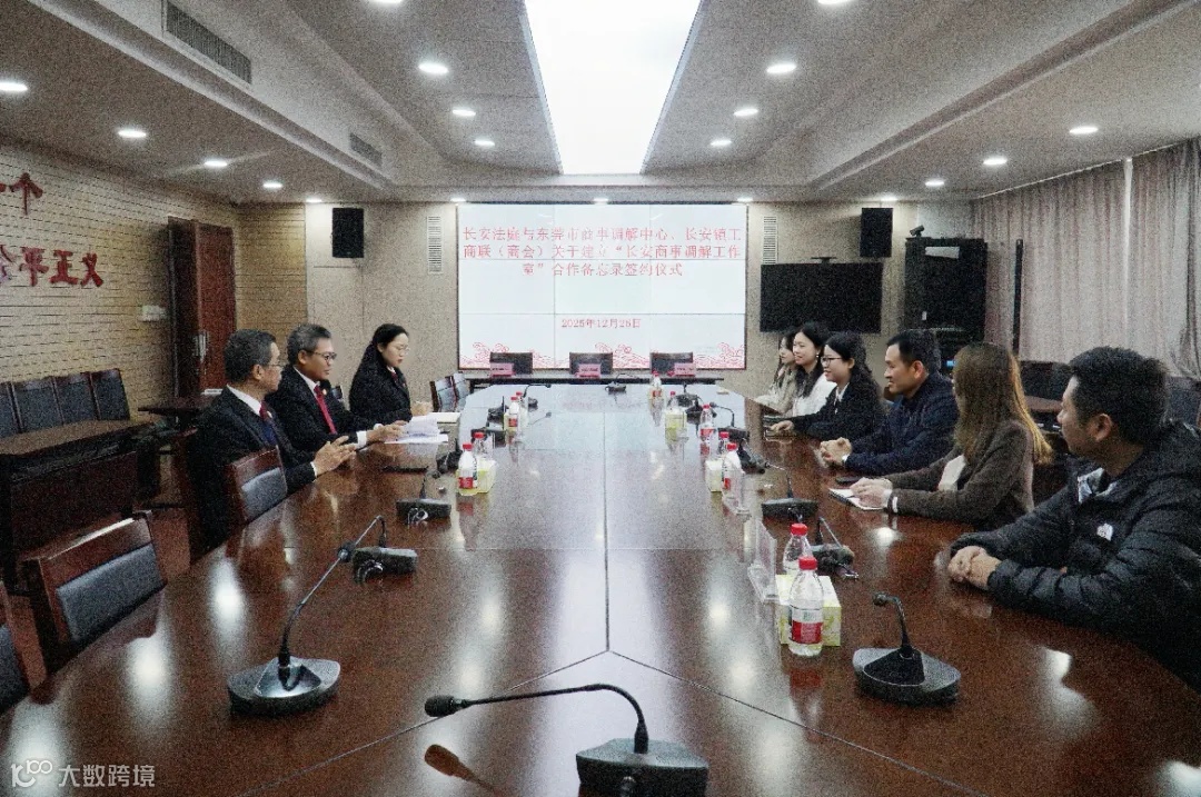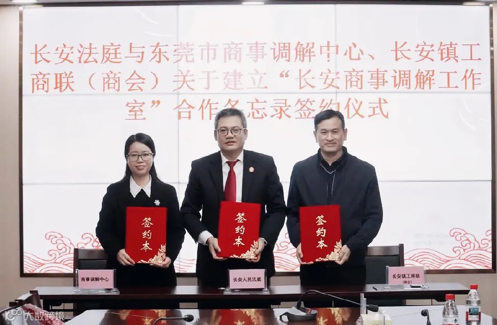 2025年12月26日,东莞市第二人民法院长安法庭、东莞市商事调解中心、长安镇工商业联合会(商会)在长安法庭举行合作备忘录签约暨“东莞市商事调解中心长安法庭工作室”揭牌仪式。长安法庭庭长梁惠坤、调解中心副主任兼秘书长梁柳仪,以及三方相关负责人和调解员出席活动。