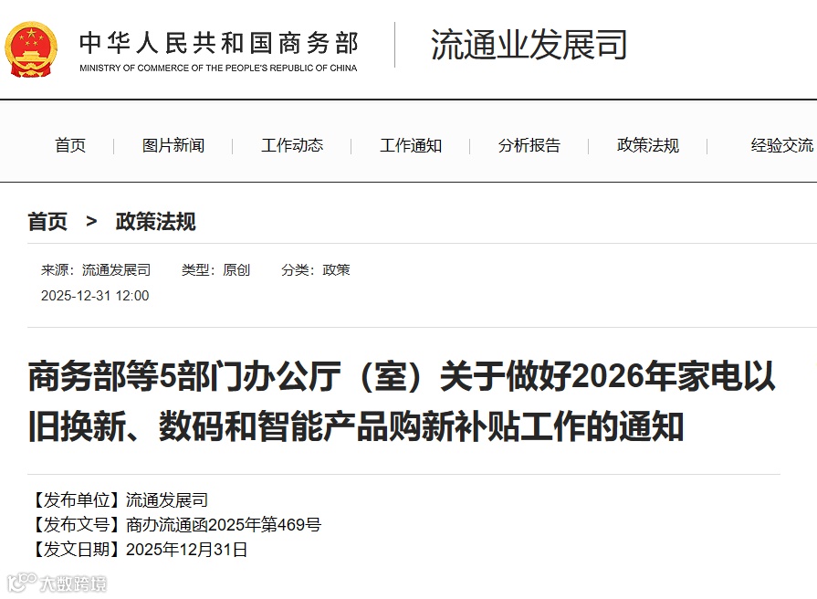 商务部等五部门联合印发《关于做好2026年家电以旧换新、数码和智能产品购新补贴工作的通知》