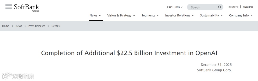 2025年12月26日(美国时间),软银集团宣布完成对OpenAI的225亿美元追加投资交割。叠加今年4月愿景基金2期(SVF2)已到位的75亿美元,以及由软银牵头组建的110亿美元银团联合投资,软银对OpenAI总投资额达410亿美元 [2] ,创下硅谷历史上规模最大的单笔私募股权融资纪录之一。