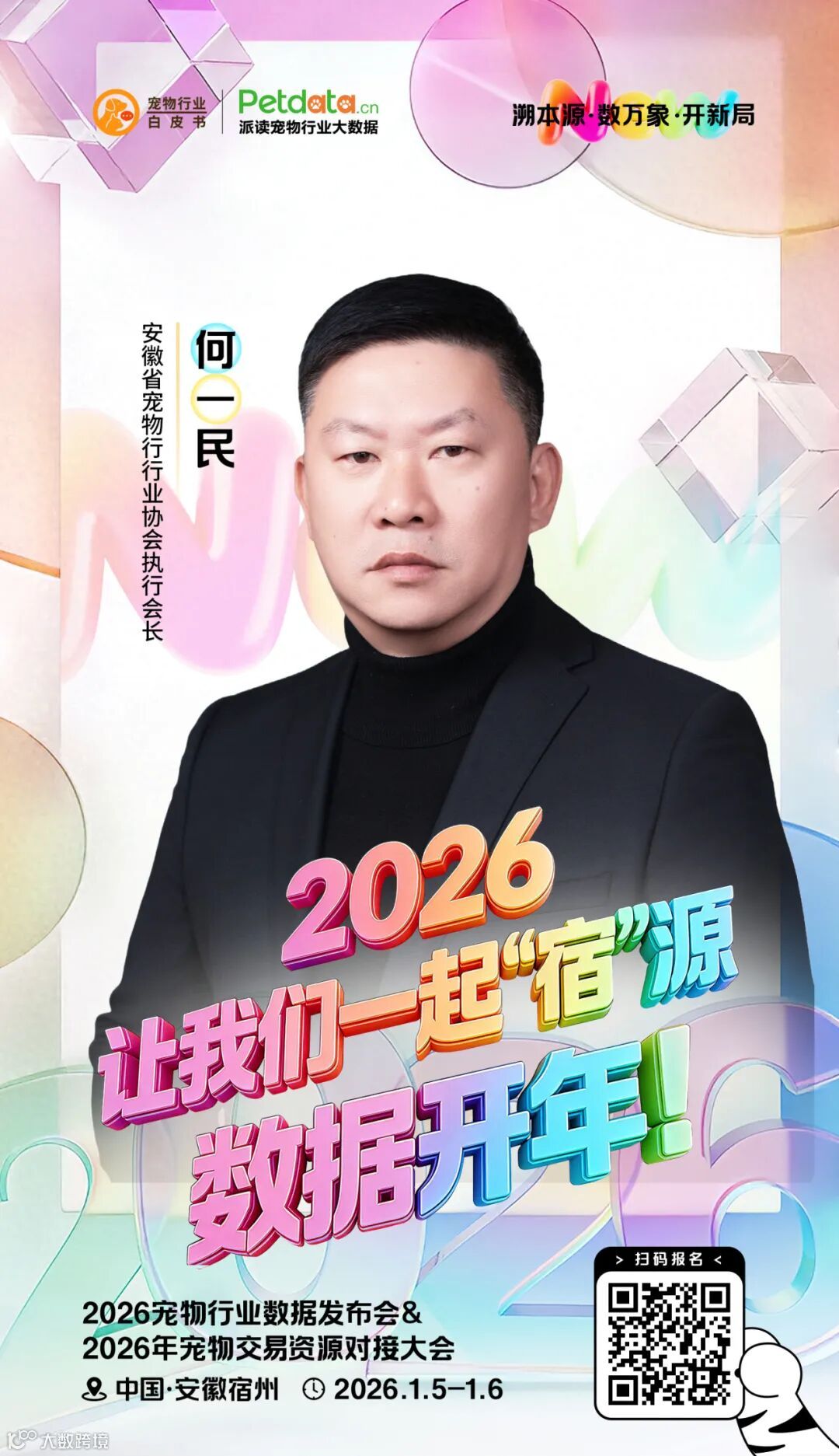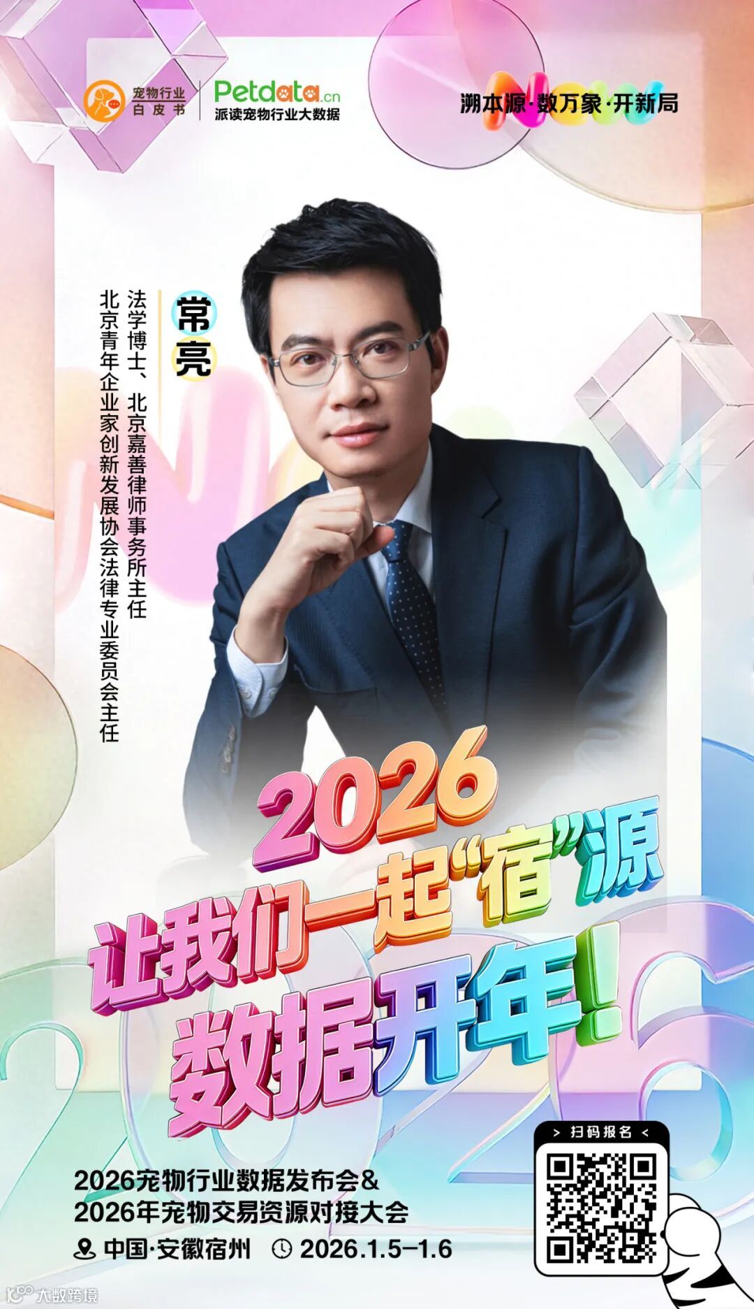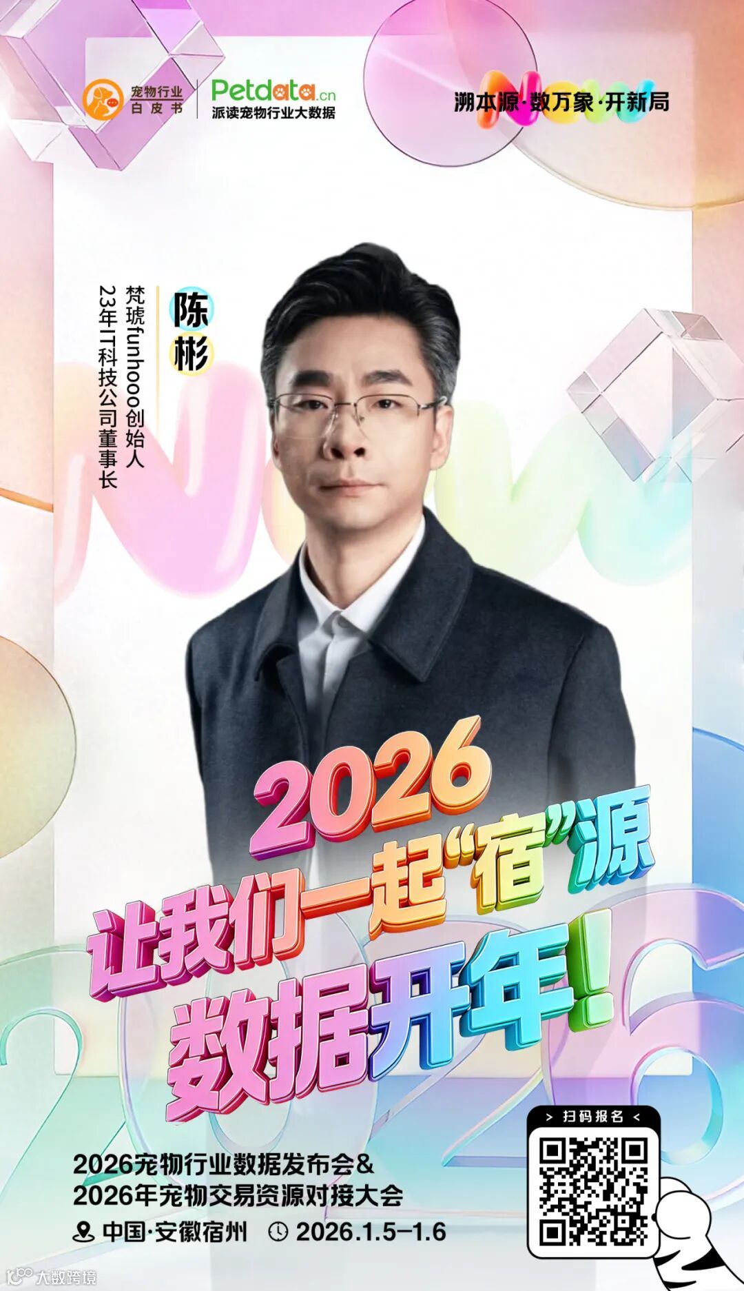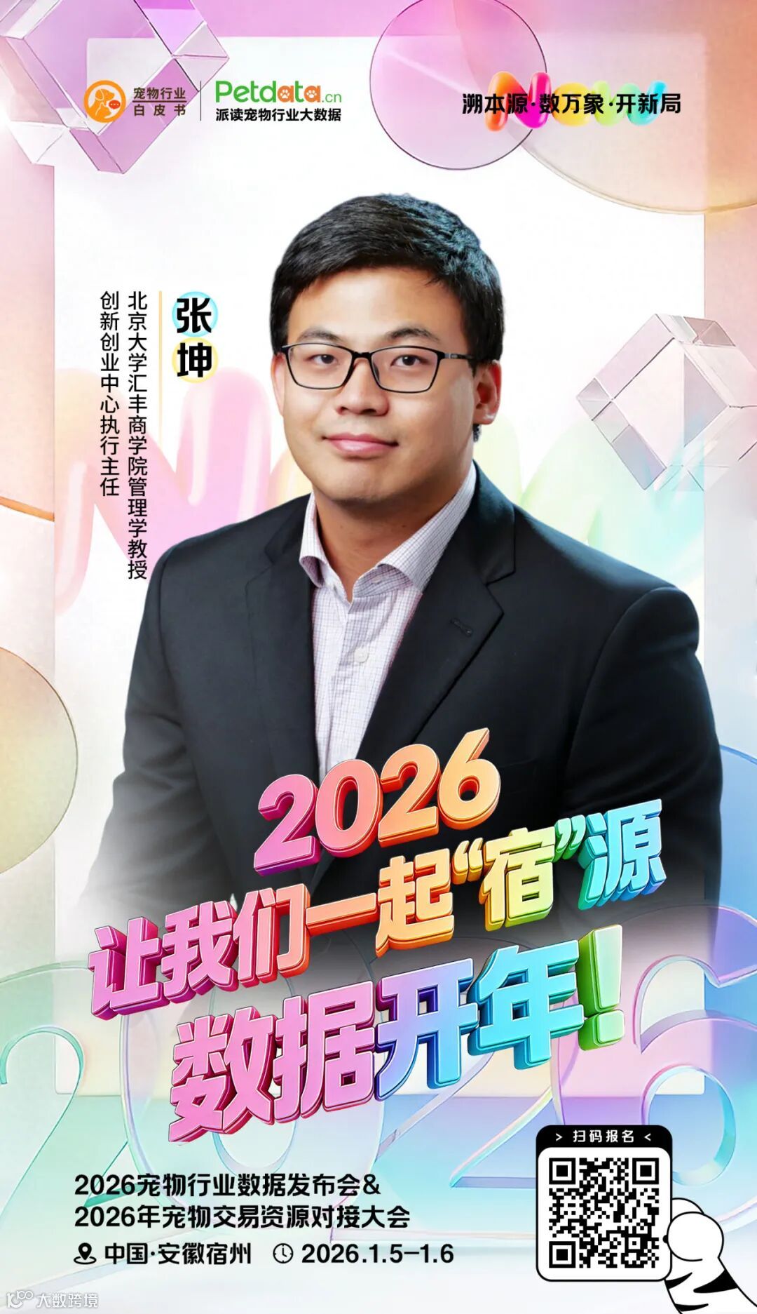 由宠物行业白皮书,派读宠物行业大数据平台主办、福建贝创投资发展集团有限公司,安徽恩宠有加宠物用品有限公司联合主办、安徽省宠物行业协会,华南农业大学动物科学学院,赣南创新与转化医学研究院,宿州市宠物经济商会协办、北京派读科技有限公司,宿州市广播电视台承办的2026年中国宠物行业数据发布会将于2026年1月5日-6日在宿州丰大国际酒店隆重举行。今天,白皮书团队将为大家介绍本次大会的重量级参会嘉宾以及他们带来的分享内容。