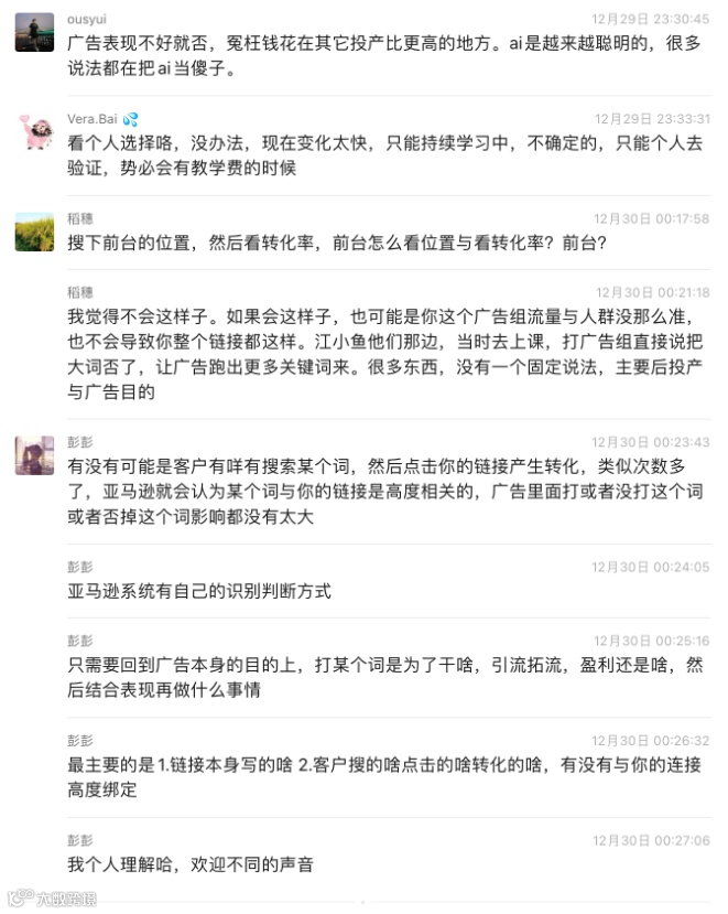 S:“搜下前台的位置,然后看转化率”,请问前台怎么看位置与看转化率?我觉得不会这样子,如果会这样子,也可能是你这个广告组流量与人群没那么准,也不会导致你整个链接都这样,之前去听过一个课,打广告组直接说把大词否了,让广告跑出更多关键词来,很多东西,没有一个固定说法,主要看投产与广告目的。