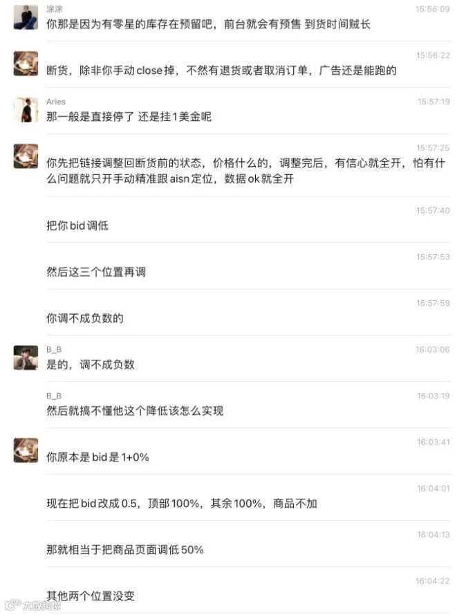 V:你先把链接调整回断货前的状态,价格什么的调整完后,有信心就全开,怕有什么问题就只开手动精准跟ASIN定位,数据OK就全开,把你BID调低,然后这三个位置再调,你调不成负数的。