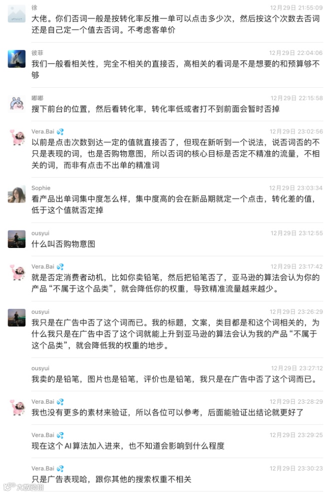 V:就是否定消费者动机,比如你卖铅笔,然后把铅笔否了,亚马逊的算法会认为你的产品“不属于这个品类”,就会降低你的权重,导致精准流量越来越少,我也没有更多的素材来验证,所以各位可以参考,后面能验证出结论就更好了,现在这个AI算法加入进来,也不知道会影响到什么程度,只是广告表现哈,跟你其他的搜索权重不相关。