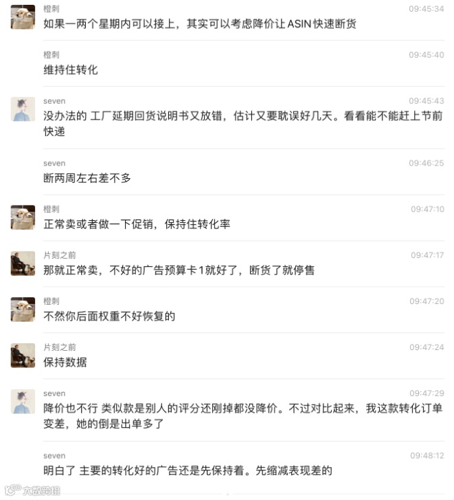 K:看断多久,断很久还是提价关促销,降低广告预算比较好,断两周以内就让它正常卖,保持高转化率高动销,补货很容易回权重的。