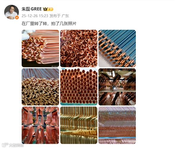 12月26日,格力市场总监朱磊公开工厂实拍图,展示大量空调铜管库存,回应近期行业关于“铝代铜”的广泛讨论。