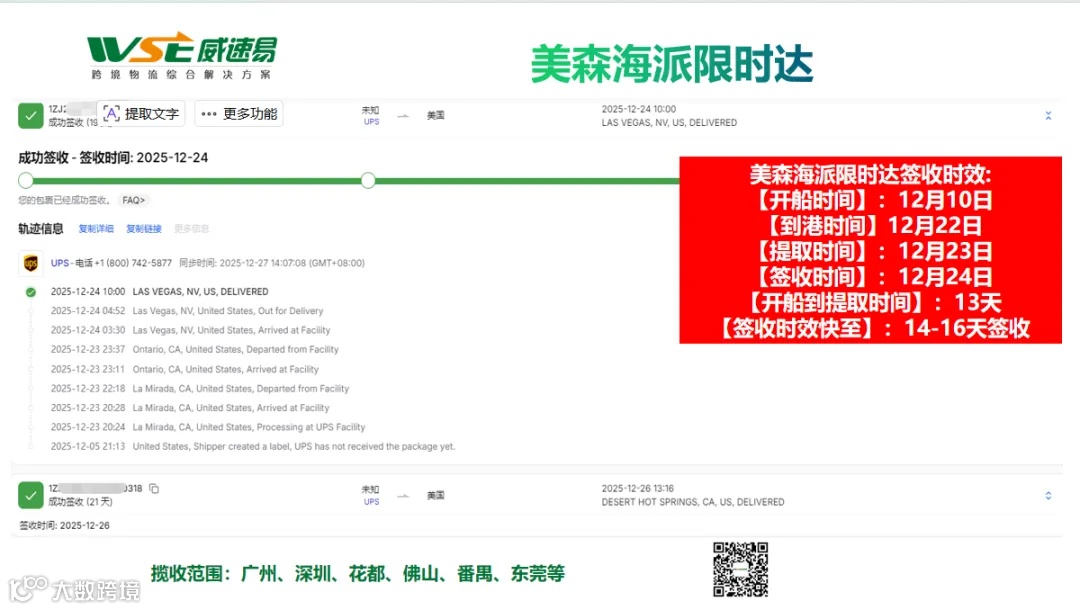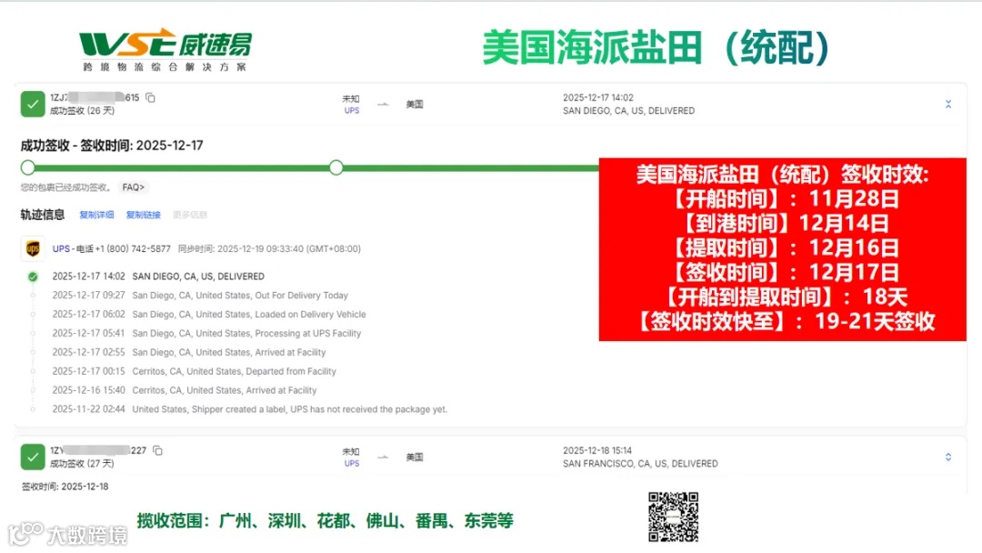 美国海派盐田(统配):最新签收时效快至:26-27天签收;