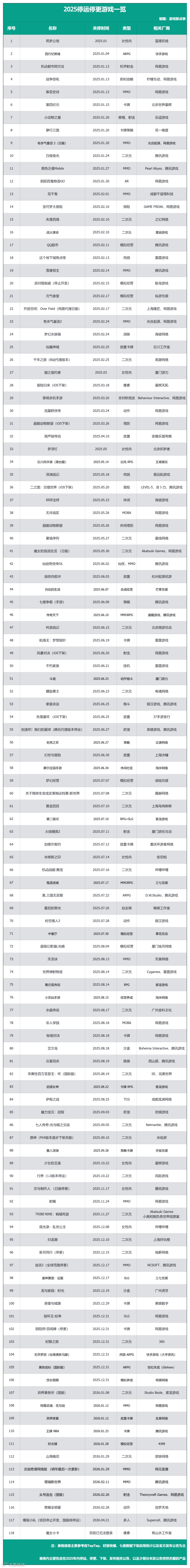 以下为2025年停运停更游戏不完全统计名单,仅供参考。