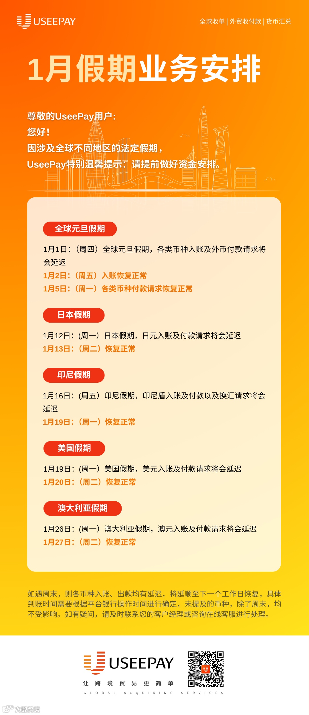 UseePay成立于2019年,致力于为出海企业客户提供安全、高效的数字化全球在线支付与收款解决方案,包括独立站收单、外贸收付款、风控管理、货币汇兑等专业支付服务,服务于跨境出口贸易电商、航空旅游、酒店出行、数字娱乐、教育、软件等多个行业客户。总部位于香港,已陆续在上海、深圳、新加坡、英国设立分支机构,高度符合全球行业监管要求,确保客户资金安全,在多个国家及地区拥有支付牌照/业务资质,包括国际卡支付行业PCI-DSS最高安全认证、香港MSO牌照、美国MSB金融牌照等。