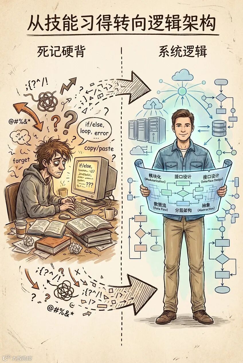 - 别学写代码,学软件工程思维: 你不需要知道这一行 Python 怎么写,但你必须知道:什么是模块解耦?什么是数据流转?当 AI 给你写出一段代码时,你是否有能力判断它的架构是优雅的还是臃肿的?