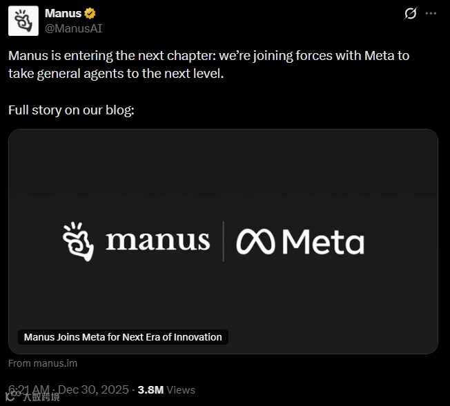 模型再强,落不了地就是成本;Manus 让 Meta 的 AI 第一次真正“下班”。这笔收购,买的不是技术,而是AI 进入 30 亿日常生活的通行证。当其他大厂还在卷参数、卷榜单时,Meta 直接用收购完成“应用层卡位”。下一次打开 WhatsApp 回复商家,背后可能就是 Manus 在跑完整个售后流程。AI 竞争,正式从“谁模型大”进入“谁能让 AI 自己干活”的实战阶段。