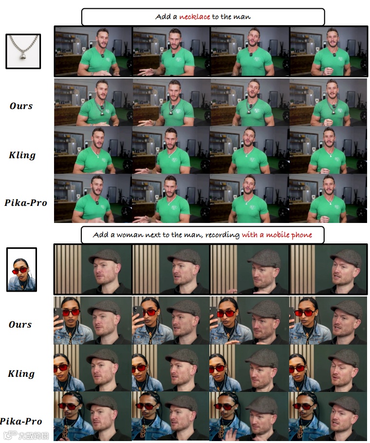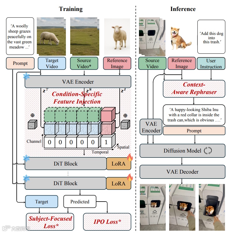 具体而言,为了保持主体-场景平衡,论文引入了一种简单而有效的条件特定特征注入机制,以明确地注入多源条件,并提出了一种新颖的渐进式训练策略,使模型能够平衡来自主体和源视频的特征注入。同时设计了以主体为中心的损失函数来提升主体的细节外观。为了进一步增强插入的协调性,提出了一种“插入偏好优化”方法,通过模拟人类偏好来优化模型,并在引用过程中加入一个上下文感知的重述器模块,将主题无缝地融入到原始场景中。