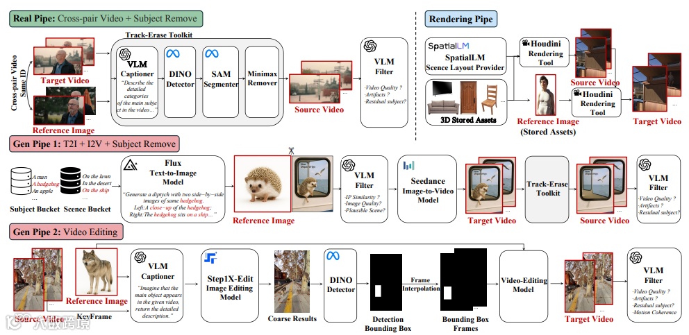 为了解决数据稀缺问题,论文提出了一种新的数据流水线InsertPipe,用于自动构建多样化的跨对数据。基于该数据流水线,论文开发了OmniInsert,这是一个新颖的统一框架,用于从单个和多个主体参考进行无遮罩视频插入。