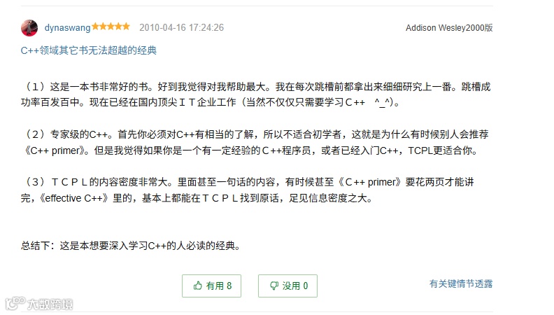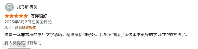 澳大利亚莫纳什大学的Alan Dorin教授直言,这是自己“最常翻阅的书”,相比之下其他C++文本都“有所欠缺”,而本书是编程收藏中“不可或缺的一部分”。