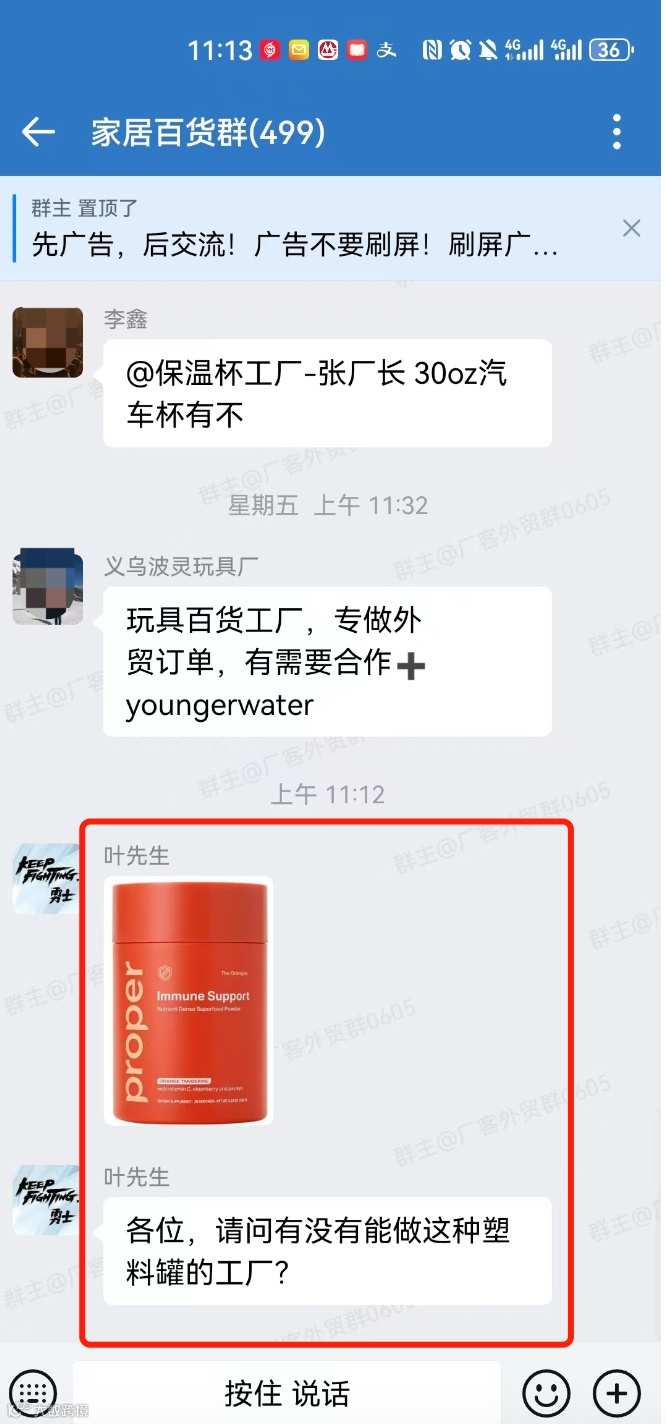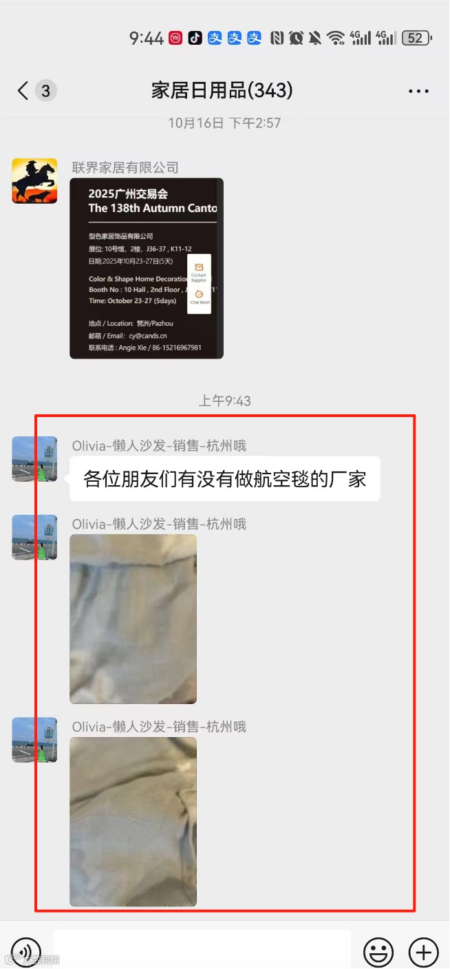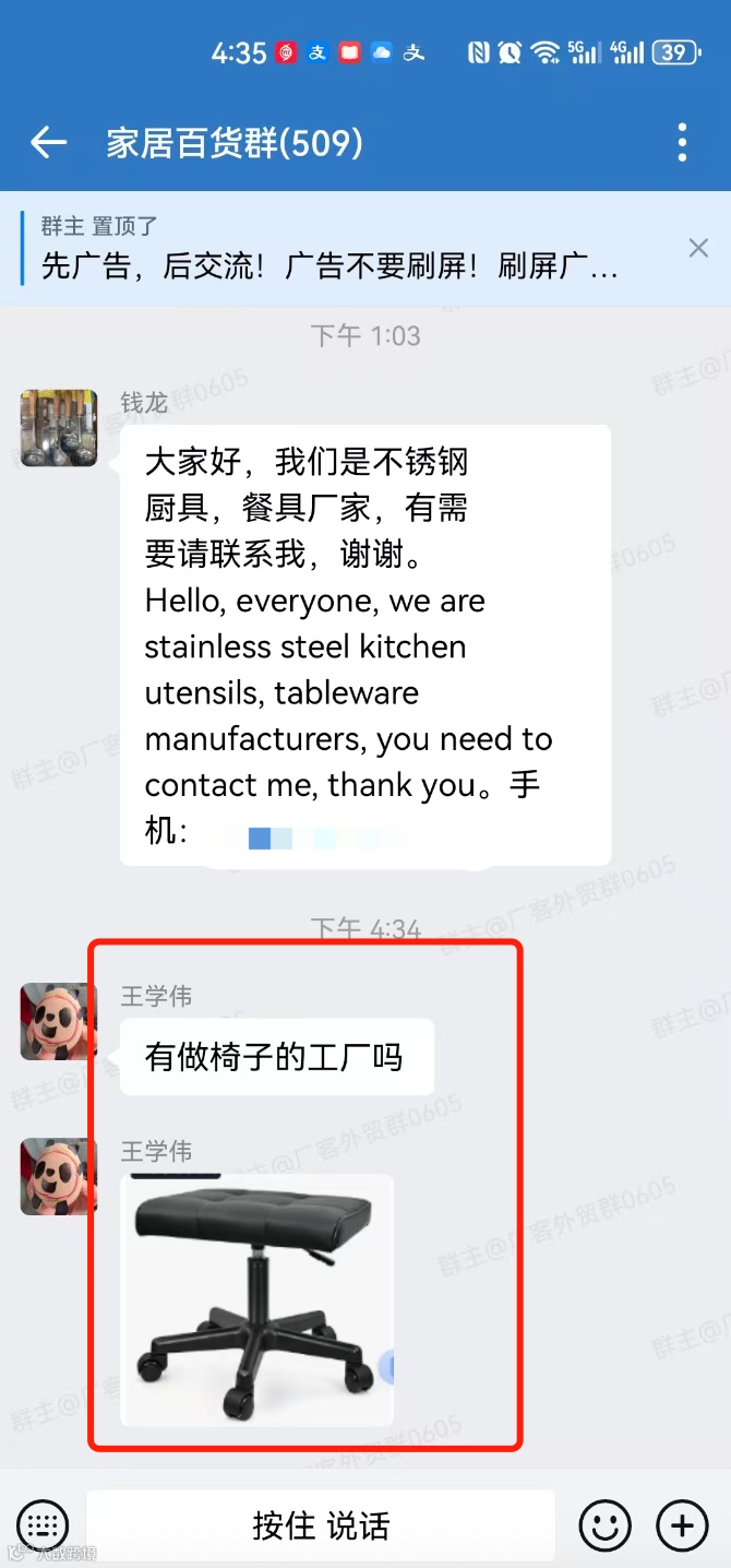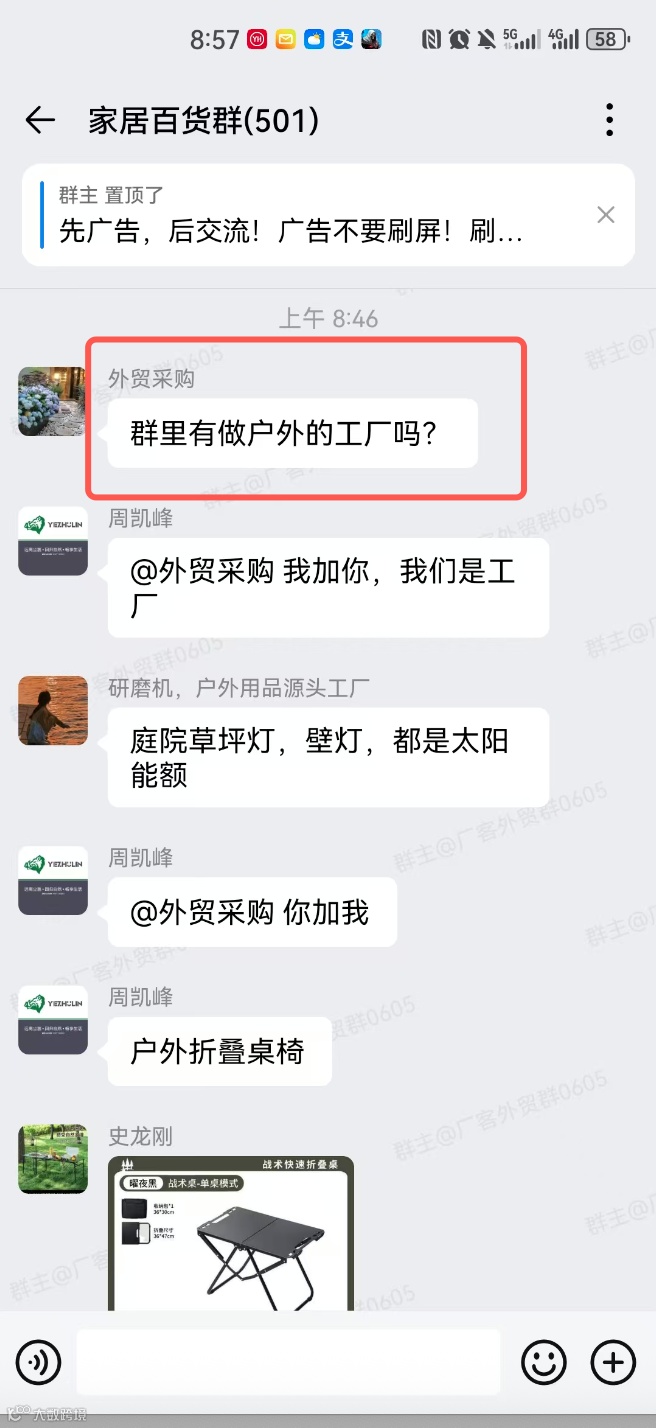 家居百货外贸采购交流群目前设有两个活跃群组,成员分别达500人和340余人,专为从事家具、家装类目外贸采销业务的专业人士设立。群内支持发布外贸采购需求、产品销售信息,文字、图片、视频等形式均可;内容需以真实业务为导向,禁止高频次广告及刷屏行为。