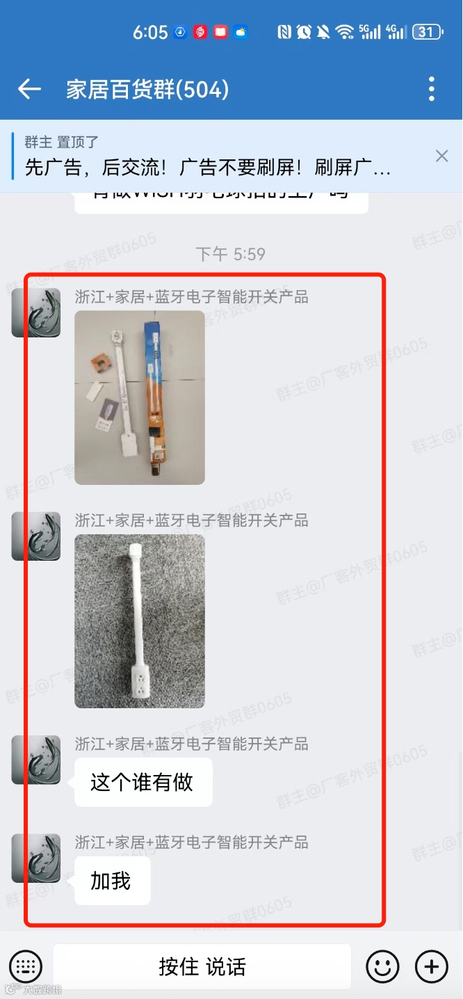 广东外贸圈家居百货外贸采购交流群目前设有两个活跃群组,成员分别达500人和340余人,专为从事家具、家装类目外贸采销业务的专业人士设立。群内支持发布外贸采购需求、产品销售信息,文字、图片、视频等形式均可;内容需以真实业务为导向,禁止高频次广告及刷屏行为。