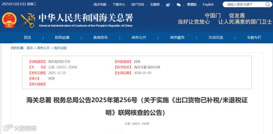 2025年12月30日,海关总署、税务总局联合发布2025年第256号公告,明确自2026年1月1日起,对《出口货物已补税/未退税证明》(以下简称《证明》)实施电子数据联网核查。