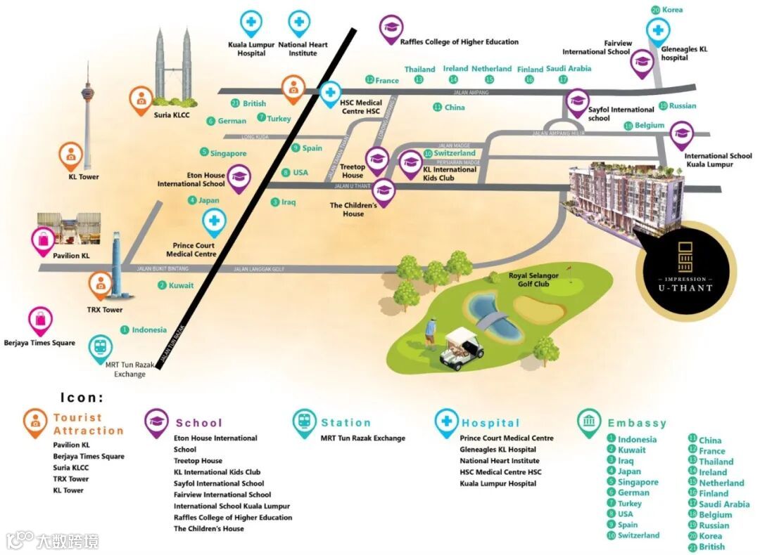 项目位于吉隆坡最安全、教育配套最成熟的高端片区:周边环绕美国、中国、日本、法国、俄罗斯、韩国、瑞士等数十家外国大使馆;步行800米可达Sayfol国际学校,1.4公里直达ISKL(吉隆坡国际学校),课程涵盖IB、IGCSE、A-Level体系,是华人家庭陪读置业首选区域 [2] 。