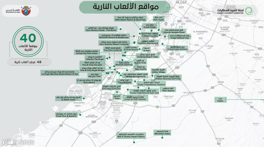 烟花秀覆盖哈利法塔、迪拜市中心、朱美拉棕榈岛、迪拜节日城、迪拜云溪港、蓝水岛、帆船酒店、迪拜世博城、棕榈岛亚特兰蒂斯酒店及杰贝阿里棕榈岛等40个地点,共48场次。多点分布可有效疏解人流、提升公共安全 [2] 。
