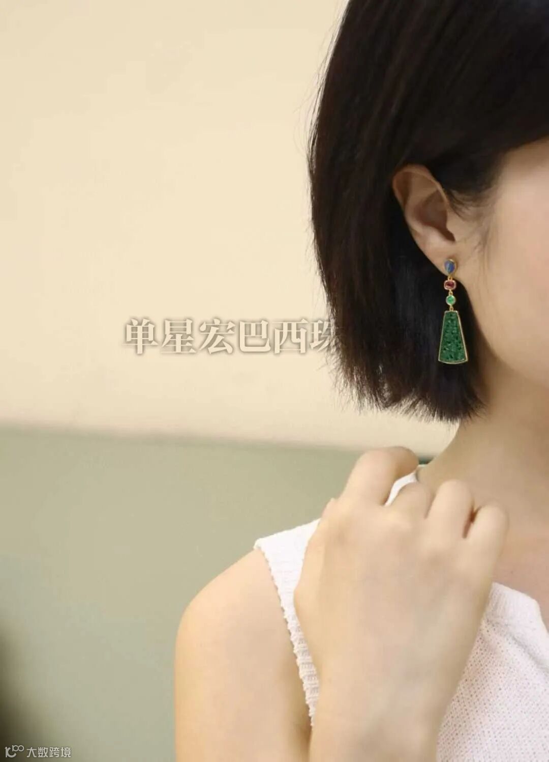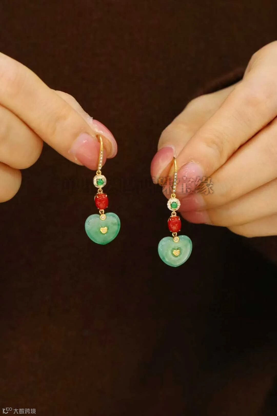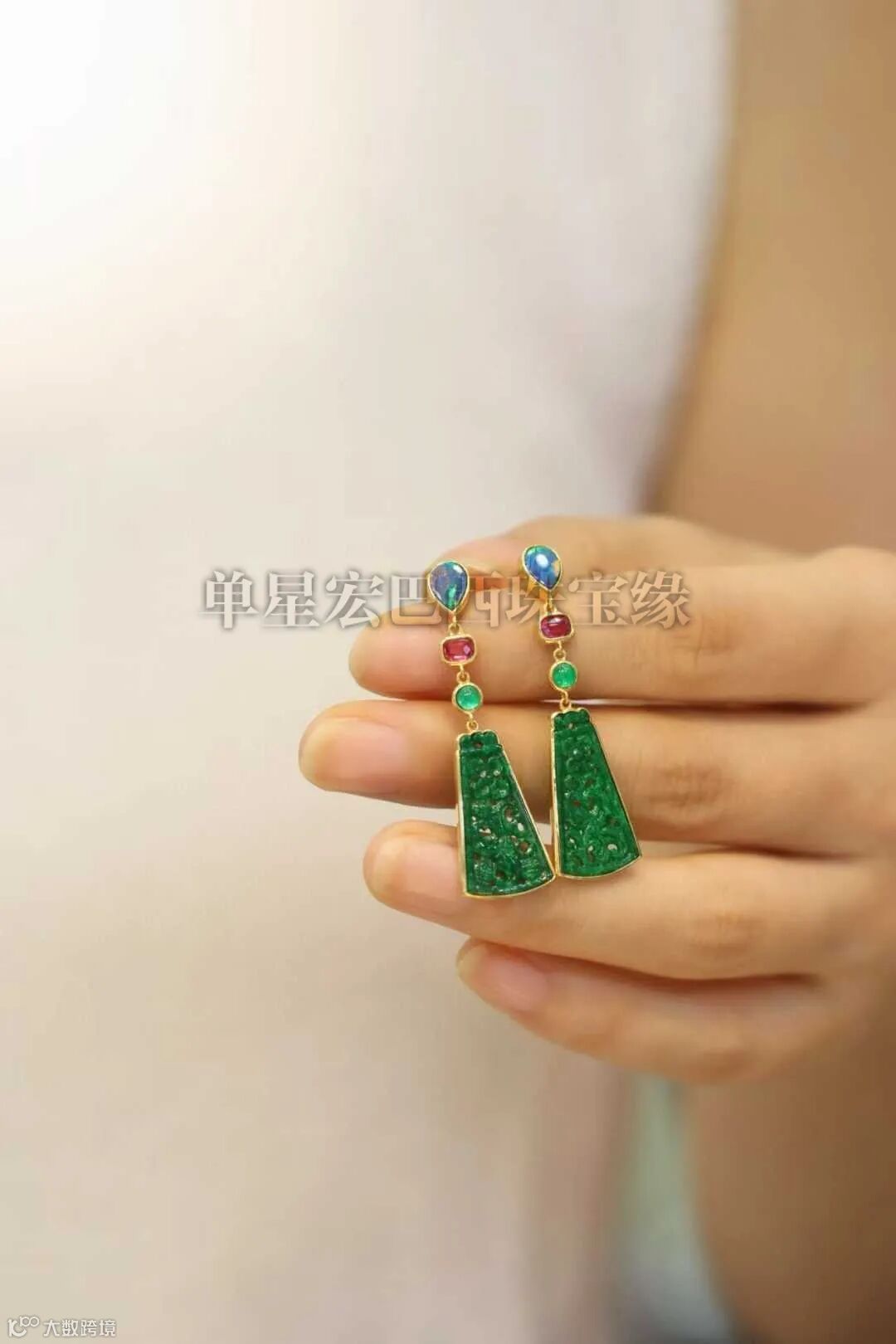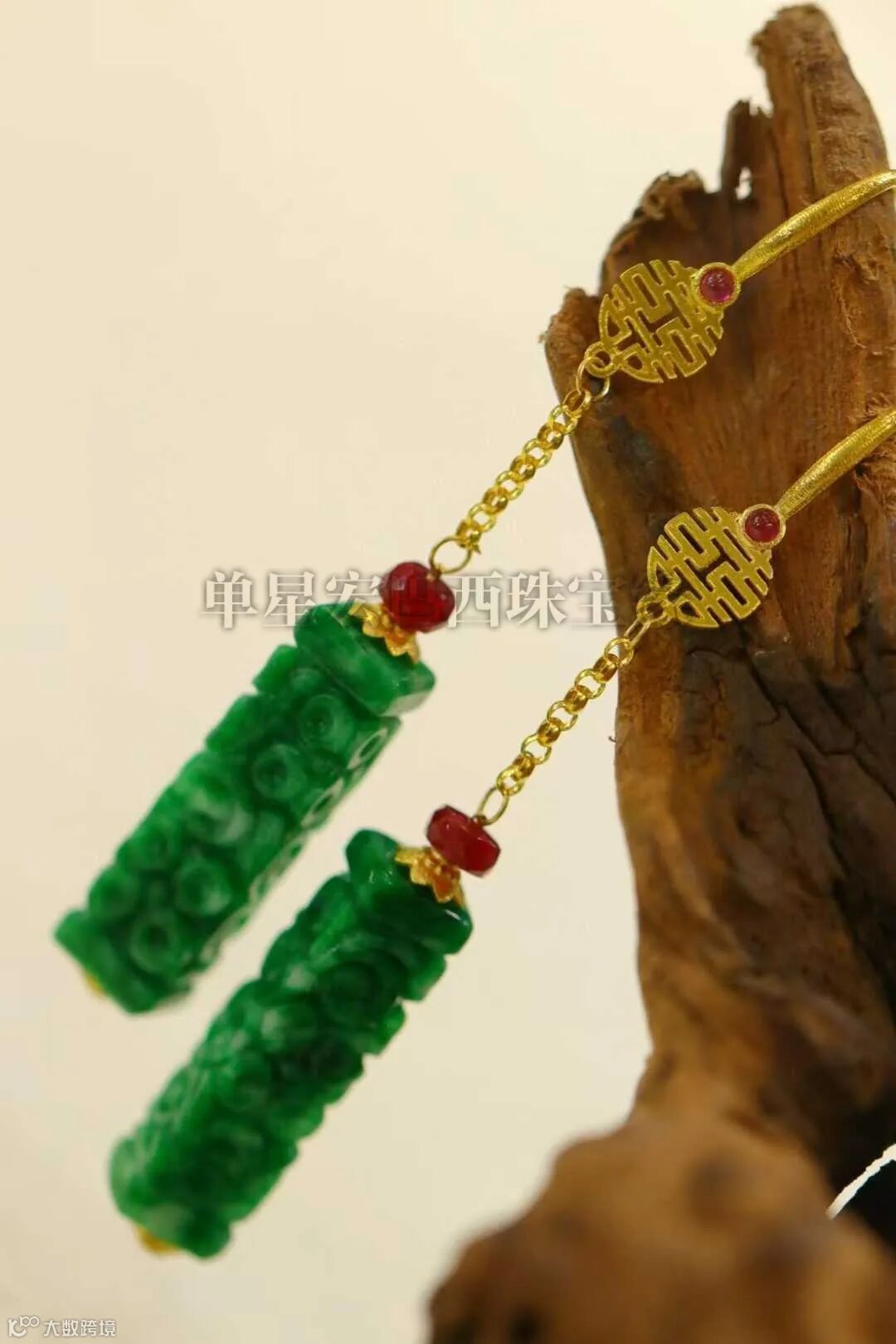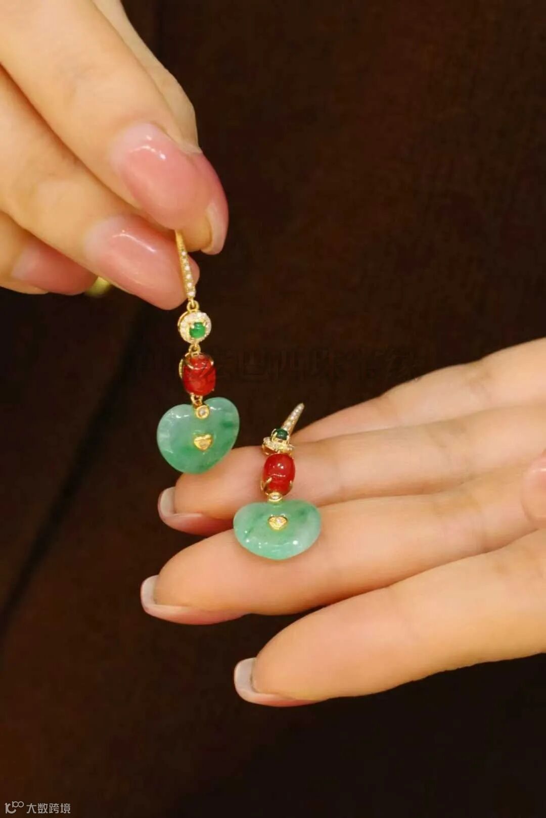 满色翡翠雕刻如意云纹,18K金耳钩嵌“囍”字,长坠设计柔化下颌线,将江南春意与中式喜庆凝于耳际 [7] 。