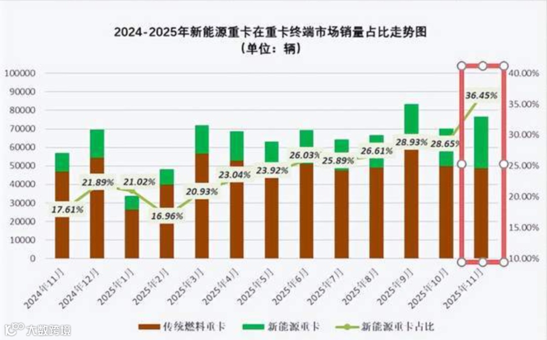 2025年11月,新能源重卡交强险上牌渗透率达36.45%,首次跨过30%临界点,标志市场从示范运营迈入规模化普及新阶段 [3] 。