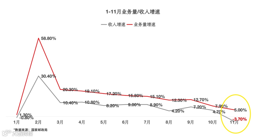2025年快递行业增速明显放缓:10月业务量增速降至7.9%,11月进一步收窄至5%,全年业务量增速预计约15%,较前两年超20%水平显著换挡;1–11月收入增速仅7.1%,11月更同比下降3.7%,行业已进入中低速增长阶段 [11] 。
