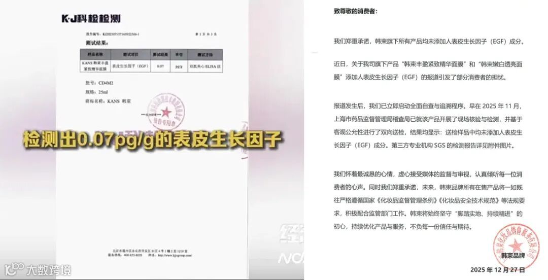 韩束于12月27日回应称:“旗下产品均未添加表皮生长因子”,并出示SGS第三方检测报告,同步下架涉事产品。