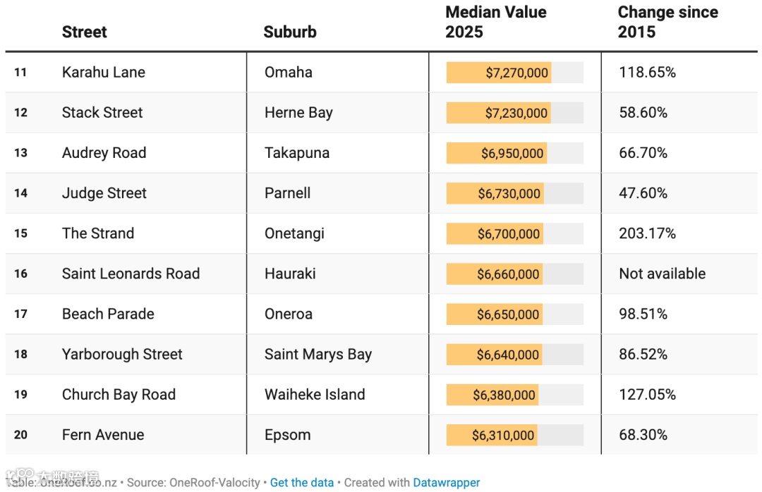 Remuera的Arney Crescent、Orākei的Karori Crescent等长期上榜的市中心街道,在最新排名中均已跌出前20。业内分析认为,主因并非需求萎缩,而是成交量过低导致中位价缺乏统计代表性 [6] 。