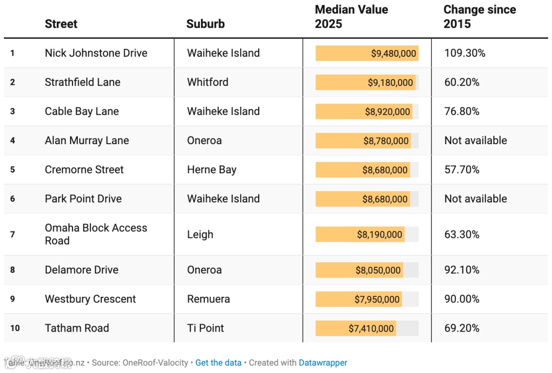 据OneRoof与估值机构Valocity联合发布的2025年榜单,激流岛独占奥克兰最贵街道前20名中的8席,囊括第一与第三位,风头明显超越Remuera、Herne Bay、Takapuna等传统豪宅核心区 [2] 。