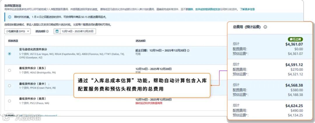 系统在卖家选择发货数量时,实时提示是否符合免配置费条件,并自动汇总不同入库选项的配置费与预估运费,支持成本对比决策。
