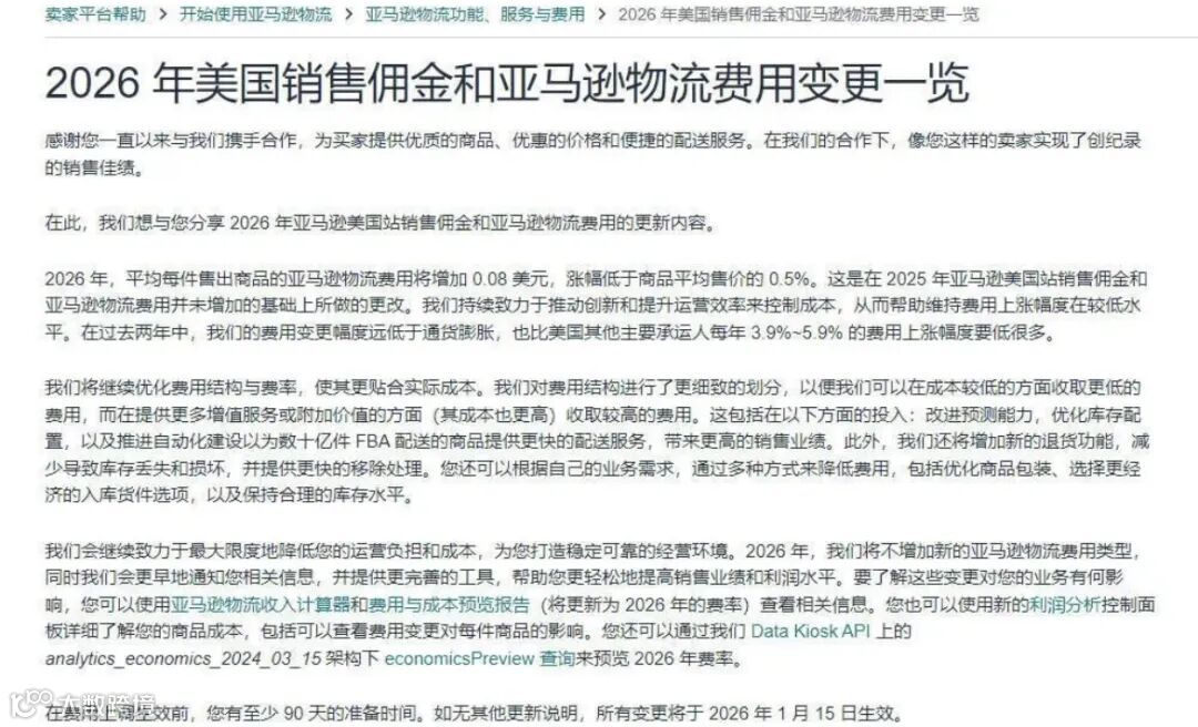亚马逊已于2026年1月1日正式公布2026年FBA费用与销售佣金调整细则。