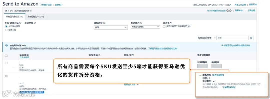 - 多SKU场景新增“稍后包装”功能,先分仓再打包;单种商品发货≥5件即可获得“优化货件拆分”资格。