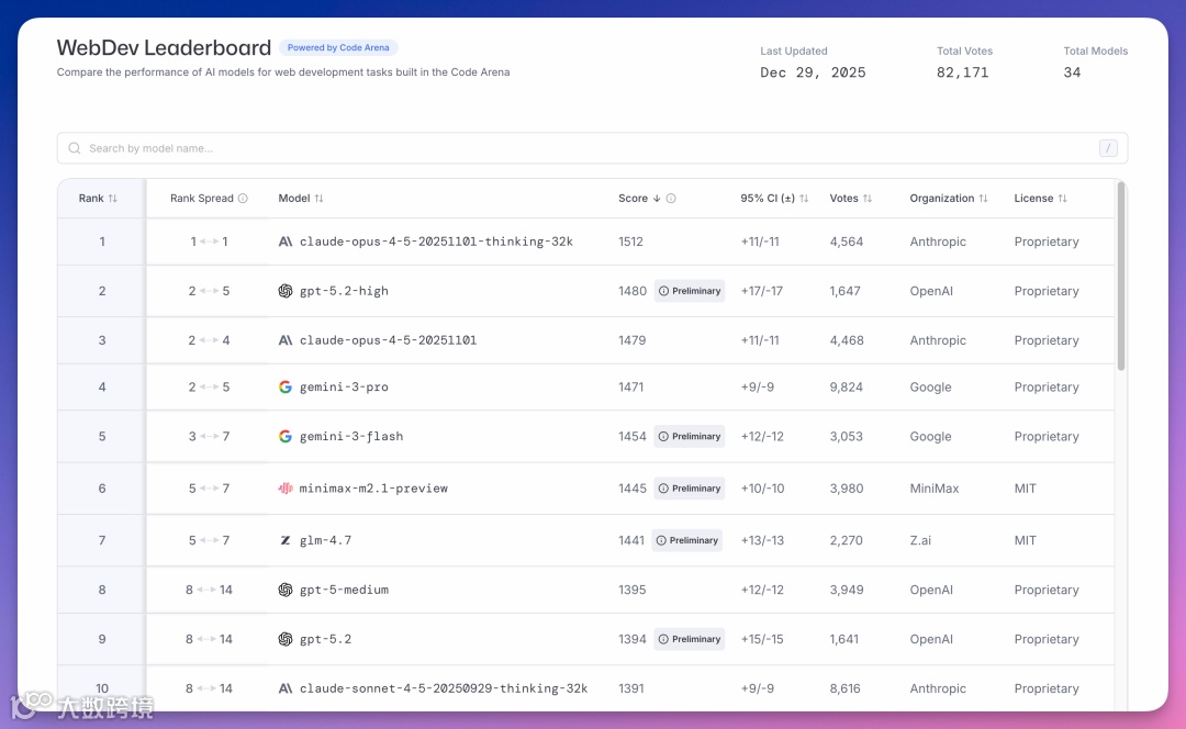 WebDev Leaderboard评估模型前端代码生成能力,截至12月29日累计投票8万。