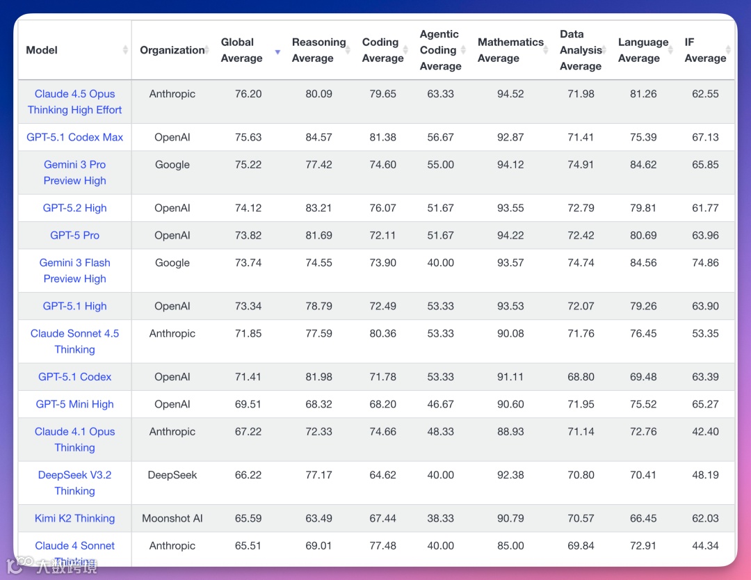AnthropicClaude 4.5 Opus Thinking High Effort以76.20分夺冠;OpenAIGPT-5.1 Codex Max以75.63分次之;谷歌Gemini 3 Pro Preview High以75.22分位列第三。国产模型中,DeepSeekV3.2 Thinking(66.22分,第十二)、月之暗面Kimi K2 Thinking(65.59分,第十三)进入榜单。顶尖模型正确率仅70%出头,凸显测试难度。需说明的是,LiveBench更新较慢,部分国产新模型尚未参评。
