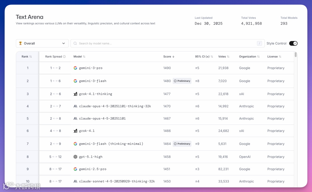 本文汇总LMArena、LiveBench、Artificial Analysis三大权威平台截至2025年12月底的最新排名。
